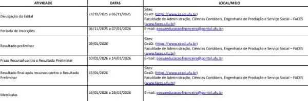 Conforme cronograma, o período de inscrições foi prorrogado: de 06/11/2025 a 07/01/2026, exclusivamente por e-mail: posuaeducacaofinanceira@pontal.ufu.br.