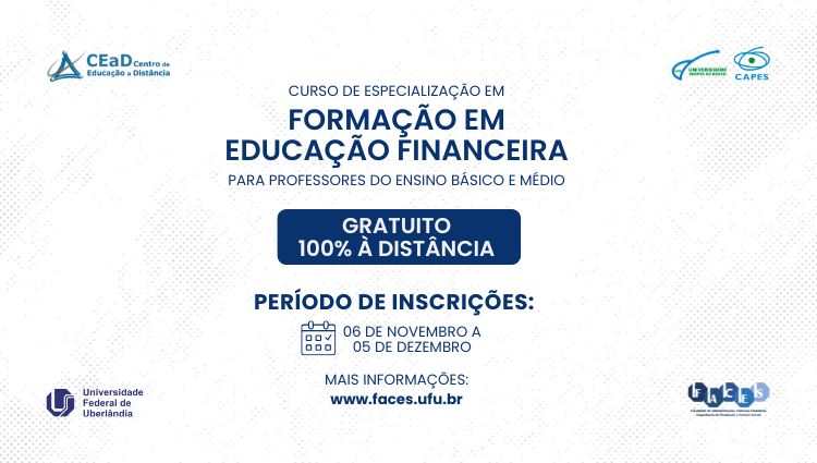 A Faculdade de Administração, Ciências Contábeis, Engenharia de Produção e Serviço Social (FACES/UFU) divulga o Edital nº 44/2025, que abre inscrições para o Curso de Pós-Graduação Lato Sensu – Especialização em Formação em Educação Financeira para Professores do Ensino Básico e Médio, na modalidade a distância, no âmbito do Programa Universidade Aberta do Brasil (UAB/CAPES/MEC).