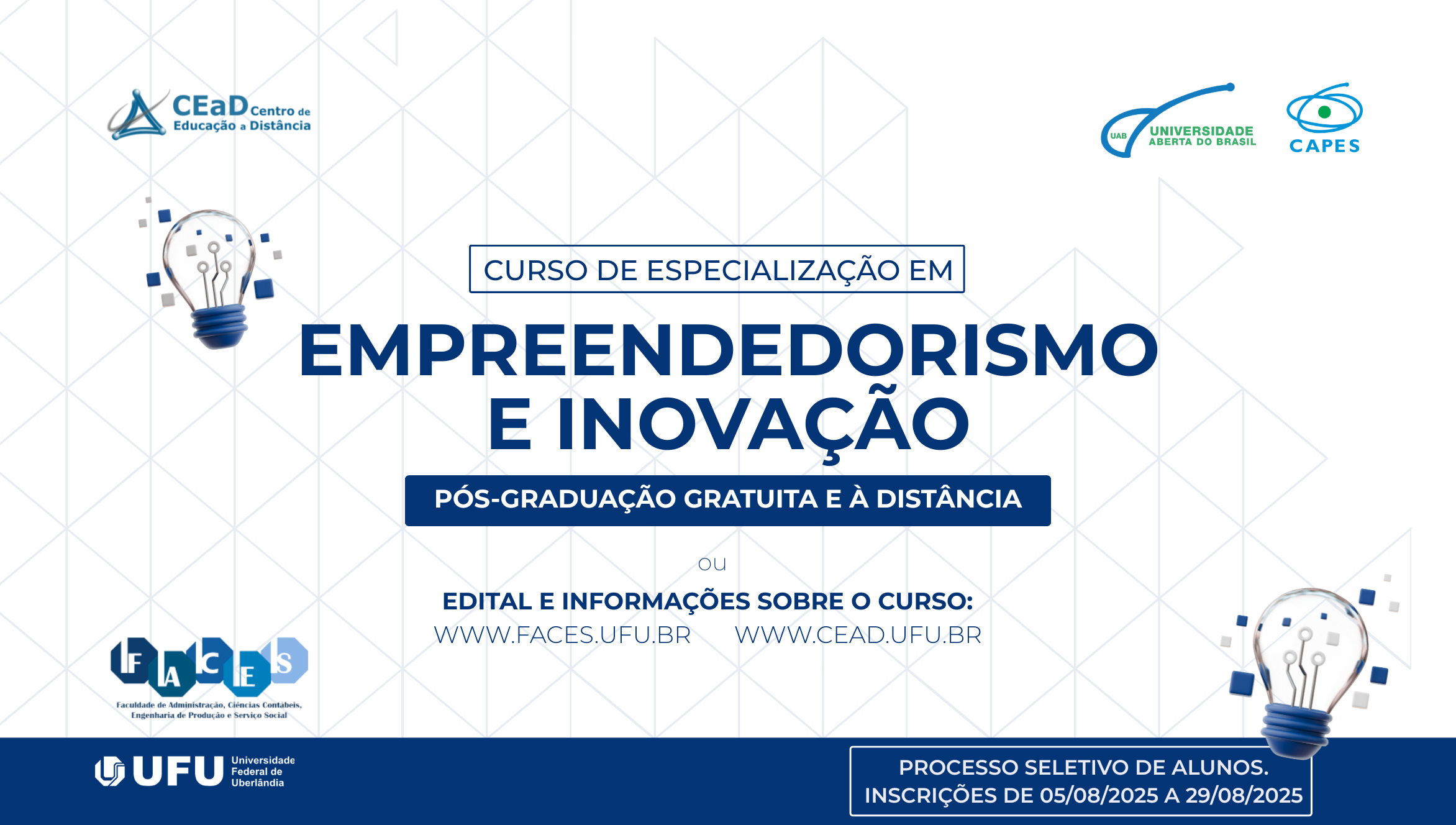 A Universidade Federal de Uberlândia - UFU torna pública a abertura de inscrições para o processo seletivo destinado ao preenchimento de vagas no CURSO DE PÓS-GRADUAÇÃO LATO SENSU - ESPECIALIZAÇÃO EM EMPREENDEDORISMO E INOVAÇÃO, na modalidade Educação à Distância, a ser oferecido de forma gratuita pela Faculdade de Administração, Ciências Contábeis, Engenharia de Produção e Serviço Social (FACES) da Universidade Federal de Uberlândia (UFU), no âmbito do Sistema Universidade Aberta do Brasil/Coordenação de Aperfeiçoamento de Pessoal de Nível Superior/Ministério da Educação (UAB/CAPES/MEC), observados os termos do Estatuto e do Regimento Geral da UFU, das normas do Conselho de Pesquisa e Pós-Graduação e a legislação pertinente e complementar da UAB/CAPES/MEC, mediante as normas contidas neste edital.