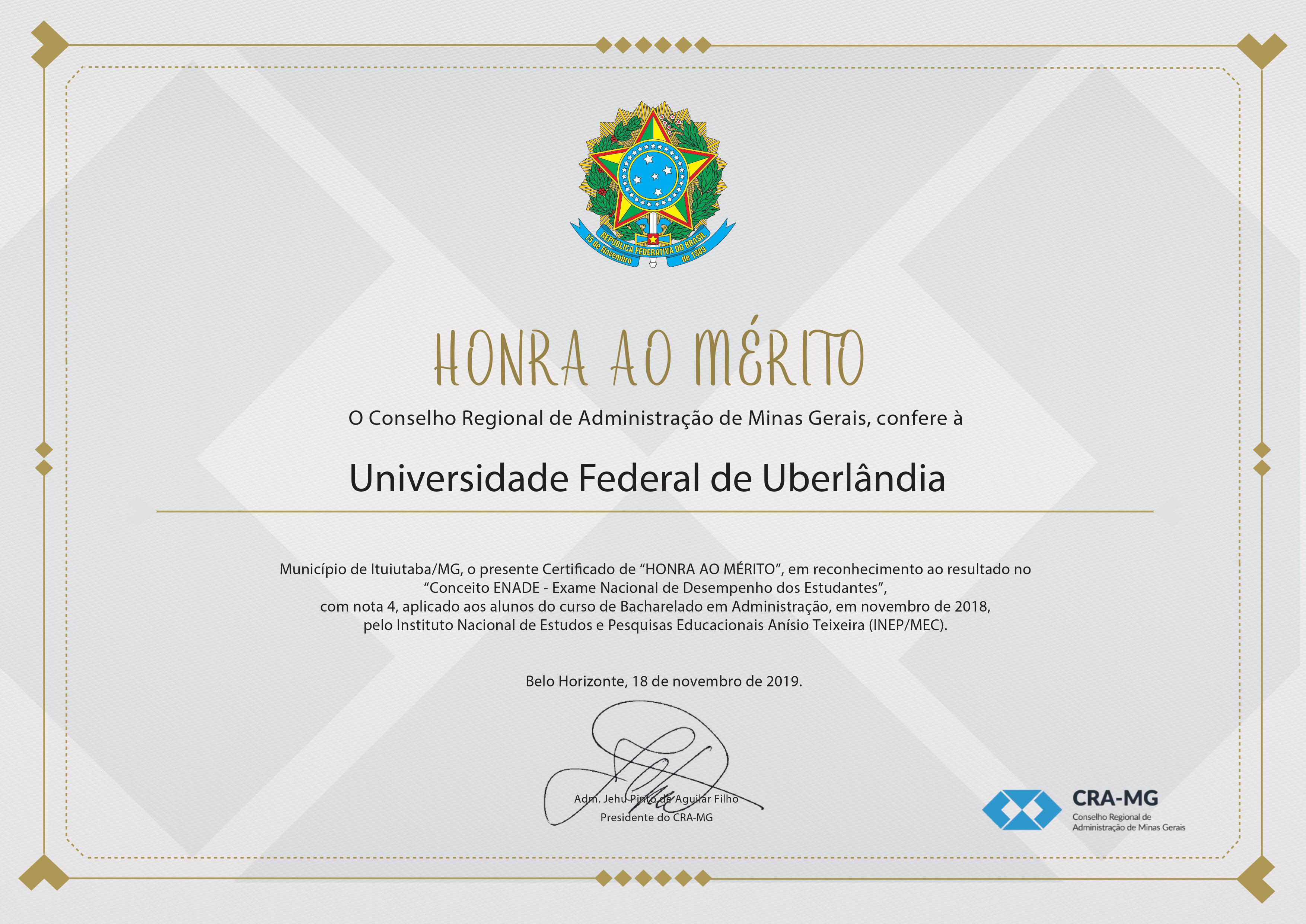 A Coordenação do Curso de Administração neste dia 19 de dezembro de 2019, esteve presente na solenidade de premiação do Conselho Regional de Administração e recebeu o Certificado de Honra ao Mérito referente aos cursos que tiveram melhor classificação no Exame Nacional de Desempenho dos Estudantes (ENADE 2018).