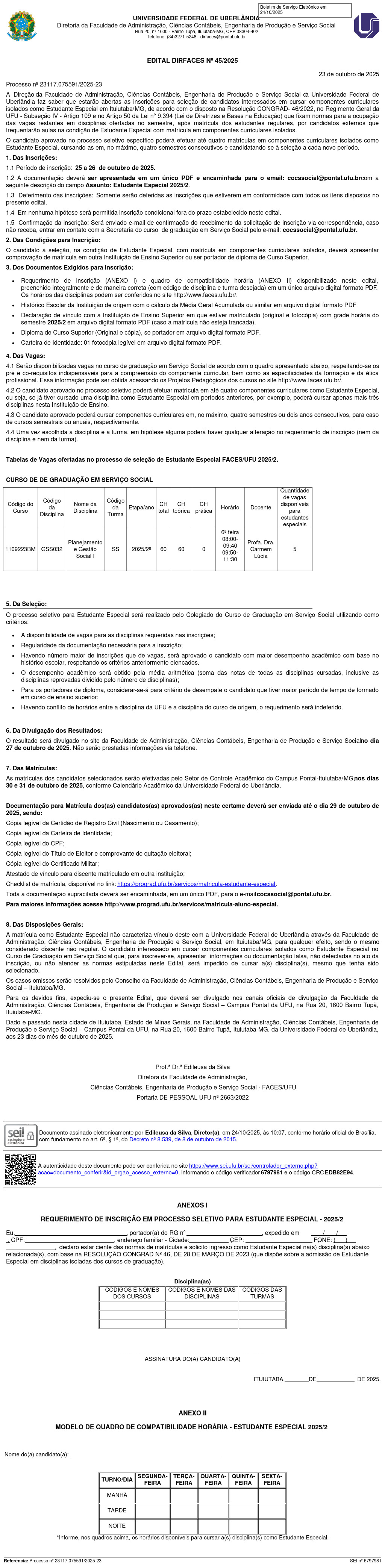 Direção da Faculdade de Administração, Ciências Contábeis, Engenharia de Produção e Serviço Social da Universidade Federal de Uberlândia faz saber que estarão abertas as inscrições para seleção de candidatos interessados em cursar componentes curriculares isolados como Estudante Especial em Ituiutaba/MG, de acordo com o disposto na Resolução CONGRAD- 46/2022, no Regimento Geral da UFU - Subseção IV - Artigo 109 e no Artigo 50 da Lei nº 9.394 (Lei de Diretrizes e Bases na Educação) que fixam normas para a ocupação das vagas restantes em disciplinas ofertadas no semestre, após matrícula dos estudantes regulares, por candidatos externos que frequentarão aulas na condição de Estudante Especial com matrícula em componentes curriculares isolados.